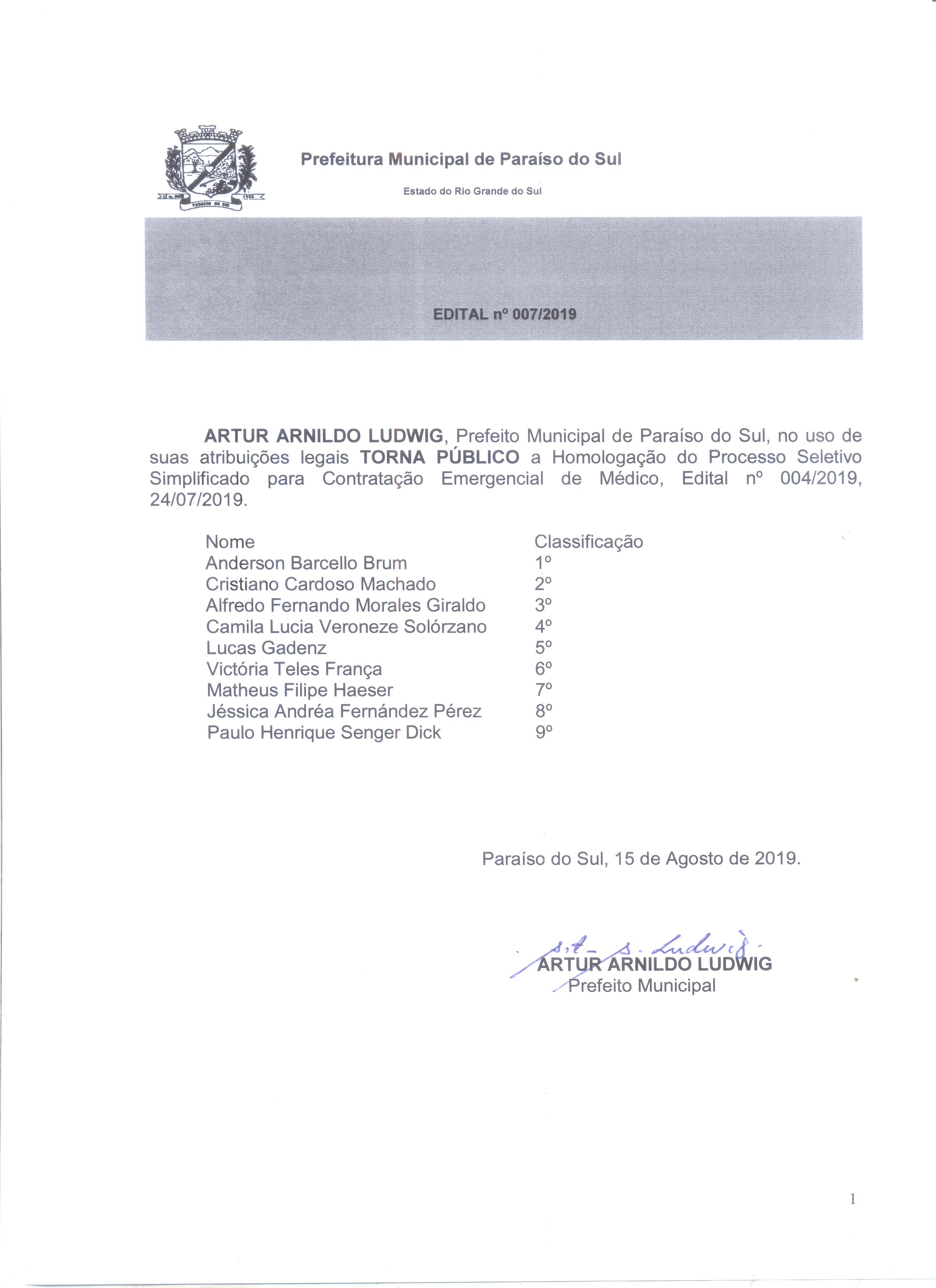 | Edital 07-2019 - Homologação Processo Seletivo Médico | ||