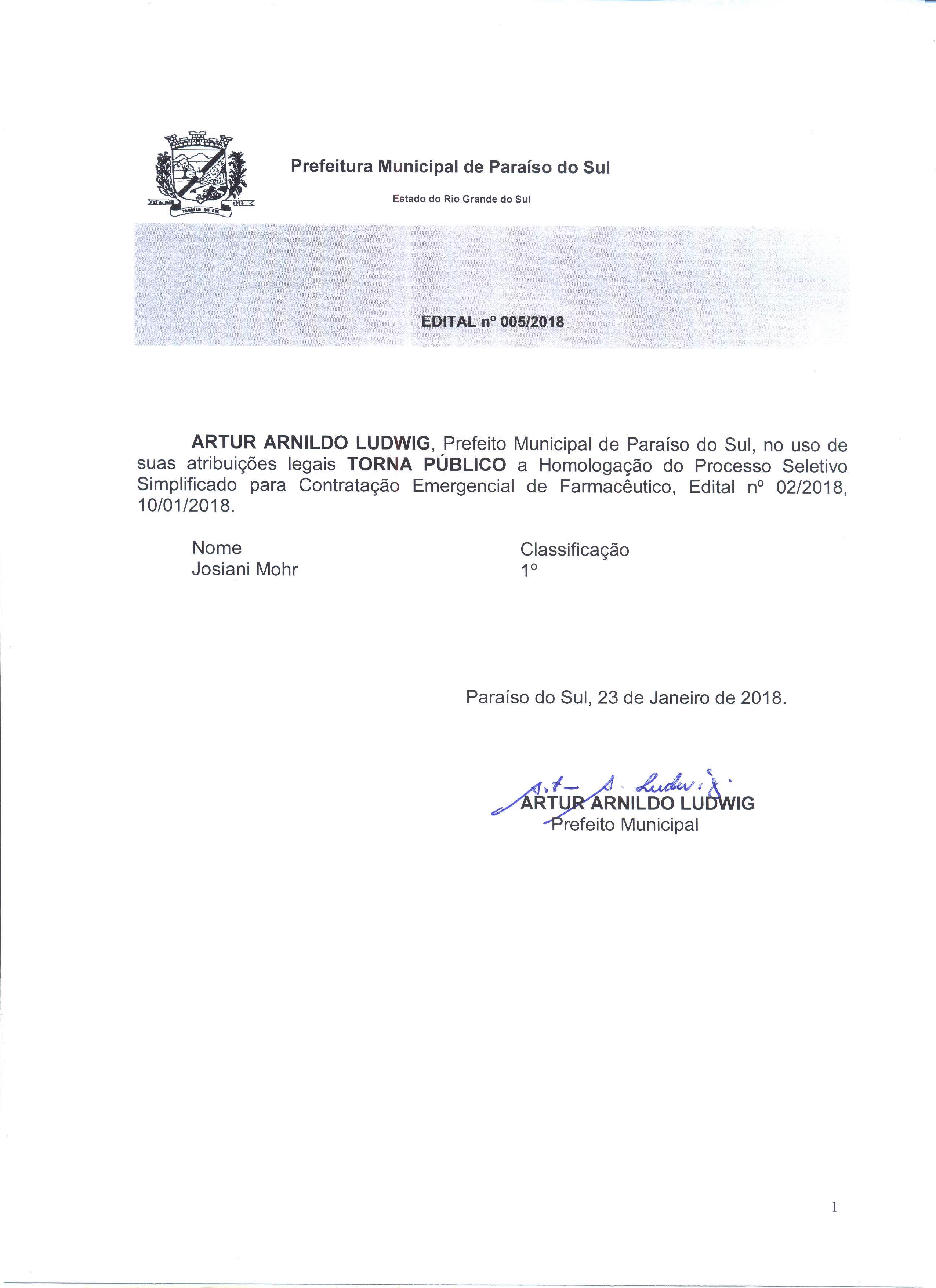 | Edital 005-2018 Homologação Farmacêutico | ||